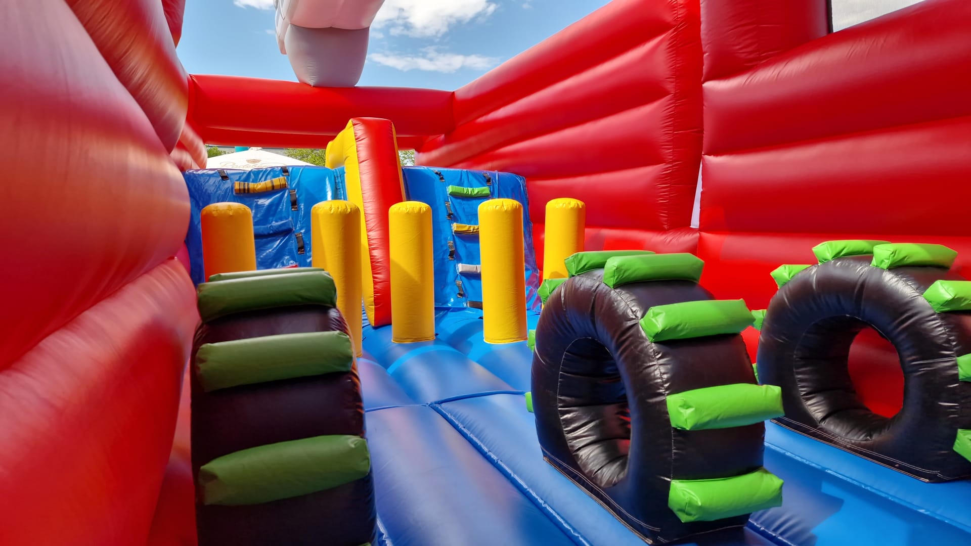 Unsere aktuelle Hindernisstrecke mit Rutsche und Tobeteil auf sagenhaften ca. 12 x 4m.